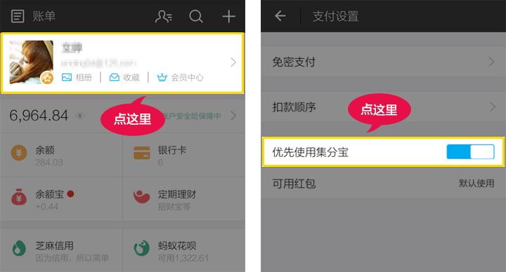 打开支付宝APP,进入 我的—>点击最上方个人信息—>设置—>支付设置—>打开 优先使用集分宝。以后每次付款,系统会默认优先使用您的集分宝抵扣,集分宝不够的部分,再使用其他方式抵扣。