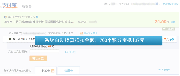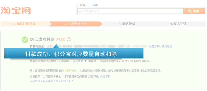 5、付款成功- 大功告成,付款成功后集分宝对应数量将自动扣除。如果付款失败,集分宝将不会扣掉,可以继续使用。