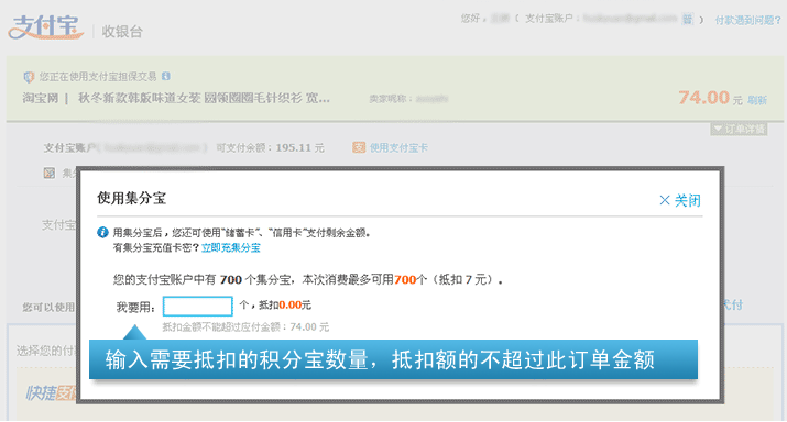 2、支付宝付款- 进入到支付宝收银台后,页面上部会显示可用集分宝数量(余额满10个便可抵现),点击“使用”链接。