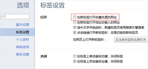 答:你需要到浏览器“设置-标签设置”里取消勾选“在新标签里打开收藏夹里的网址”选项